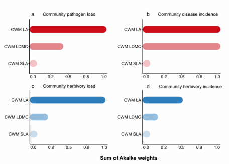 图1 基于模型筛选的群落加权平均功能性状对植物病害与植食胁迫的赤池权重之和