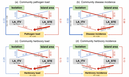 研究发现,群落加权平均叶面积是预测群落病害、植食的最佳性状(图1);通过将 CWM LA 按照拆分为物种周转效应与种内变异效应,发现隔离度主要影响物种周转(99.99%),而面积主要驱动种内变异(60.42%)。贝叶斯结构方程模型进一步揭示(图2),隔离度对群落病害负荷与发生率存在显著直接抑制效应,对植食无直接显著影响;但岛屿面积在群落水平并无直接显著效应。此外,隔离度通过促进物种周转间接加剧群落病虫害严重度。隔离度对病虫害的直接抑制效应与间接促进效应之间的平衡决定了群落水平的病虫害严重度。