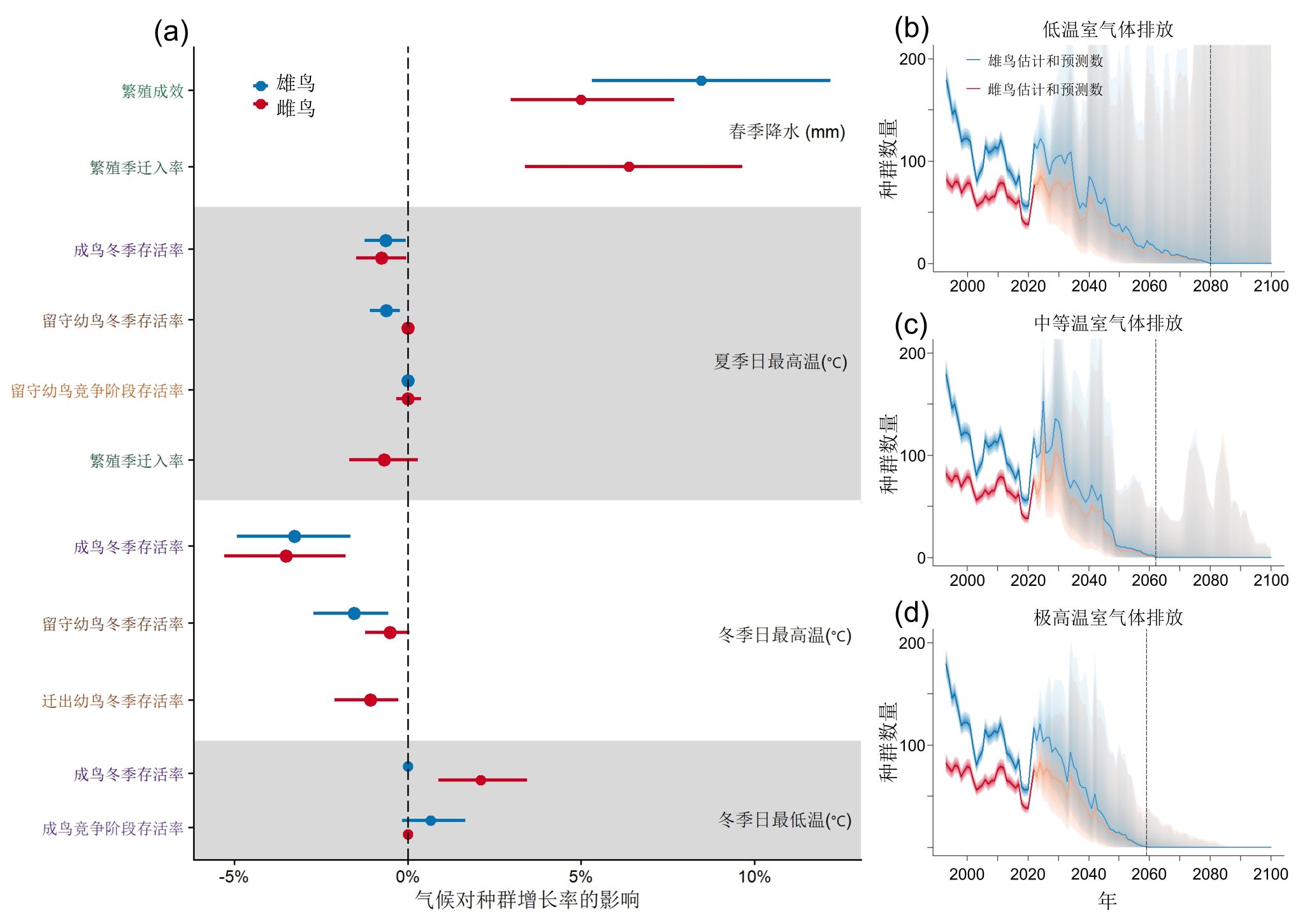 吕磊研究员及其合作者利用澳洲华丽细尾鹩莺(Malurus cyaneus)长达30年(1993–2022)的个体繁殖、表观存活、迁入和种群数量数据,使用整合种群模型(Integrated Population Model)和路径分析,定量评估了气候如何通过影响各个种群统计参数进而决定种群动态,并预测了该种群在未来气候变化情景下的生存力。研究表明,气候可通过多达11个种群统计参数的路径影响雌性和雄性鹩莺的种群动态(图1a)。春季降水越多,繁殖成效和雌性幼鸟的迁入率越高,会促进种群增长。然而,夏季和冬季的日最高温越高,成鸟以及对极端气候更敏感的幼鸟在冬季的存活率越低,最终限制种群增长。鉴于构建的种群模型能够高度拟合实际调查到的种群数量,本研究进一步预测了华丽细尾鹩莺未来的种群动态。综合21个气候模型的气候随机性,并同时考虑种群密度制约和统计随机性后,研究发现,在分别代表未来气候变暖逐级加剧的低、中等和极高温室气体排放情景下,种群均将急剧衰退并快速灭绝,且排放越高,灭绝发生得越早(图1b, 1c, 1d)。