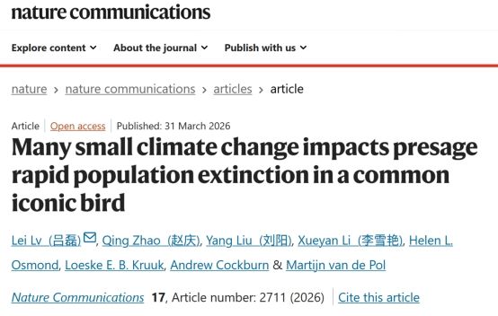 近日,海南大学生态学院动物生态学研究创新团队的吕磊研究员及其合作者在《Nature Communications》期刊在线发表题为“Many small climate change impacts presage rapid population extinction in a common iconic bird”的研究成果。