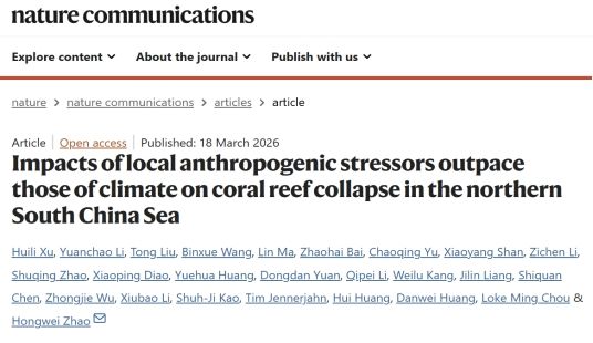 近日,海南大学生态学院赵洪伟教授团队在《Nature Communications》期刊在线发表题为“Impacts of local anthropogenic stressors outpace those of climate on coral reef collapse in the northern South China Sea”的研究成果,首次系统量化解析了南海北部珊瑚礁退化的驱动机制,提出基于陆海统筹的海洋环境治理与珊瑚礁保护对策。